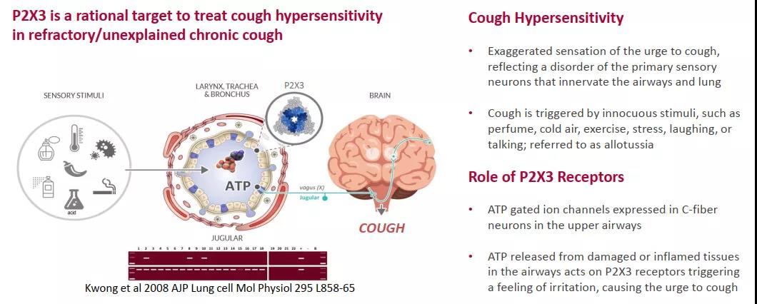 P2X3 受体是嘌呤类受体家族中的配体门控离子通道。研究显示,P2X3 受体的过度活化与感觉神经元的超敏化 (hyper-sensitization)有关。损伤或感染引发的气道和肺部神经元超敏反应可引起过度、持续和频繁地咳嗽。此外 P2X3 受体还特异性表达在初级感受神经元上,其高表达和激活可以导致慢性疼痛模型动物的痛觉敏化,对生理性和病理性痛觉调节产生变化。