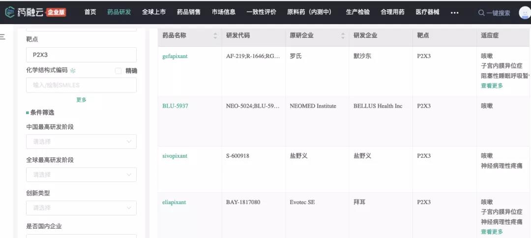 经药融云查询,全球范围内,P2X3新药在研的还有拜耳的Eliapixant(BAY 1817080)、Bellus Health的BLU-5937、日本盐野义的Sivopixant、中国生物制药(北京泰德)的TCR1672、朗来科技(启瑞)的QR052107B、南新制药等等。