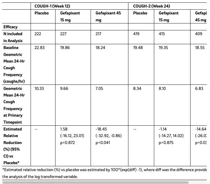 2项临床试验研究均达到了主要终点:与安慰剂组受试者相比,每天接受2次45mg剂量Gefapixant的治疗组患者在第12周(COUGH-1研究,n=730)和第24周(COUGH-2研究,n=1314)的24小时咳嗽频率(24小时录音-客观地测量每小时咳嗽次数)达到统计学意义的显著降低。具体而言,COUGH-1研究中,第12周时接受45mg每天2次G efapixant治疗的成年患者与安慰剂组患者相比,在24小时咳嗽频率方面相对于安慰剂减少18.45%;在COUGH-2研究中,第24周时该数据相对于安慰剂组减少14.64%。