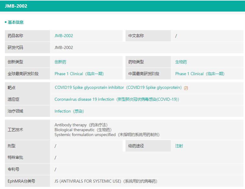 JMB2002是由济民可信自主开发的新冠中和抗体JMB2002已于2021年6月完成国内临床I期研究,在健康受试者中的耐受性、安全性、药代动力学特征和免疫原性均达到预期结果。2021年3月,JMB2002注射液获FDA批准在美国开展临床试验。目前,济民可信已经完成2000升JMB2002临床药品的制备,可随时启动下一步临床研究。