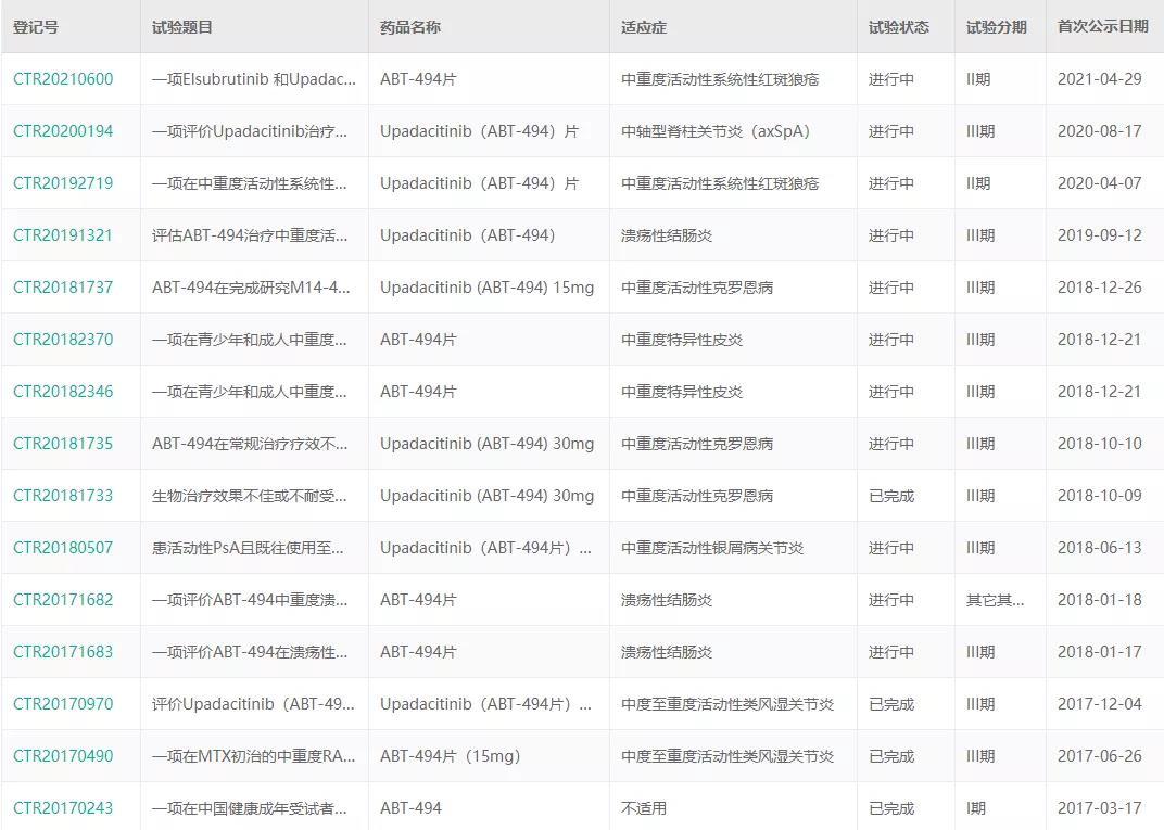 目前,乌帕替尼已获FDA批准治疗中重度活动性类风湿关节炎成人患者,并在克罗恩病、特应性皮炎、银屑病关节炎、溃疡性结肠炎、中轴型脊柱炎等多种炎症性疾病的3期临床试验中获得积极结果。