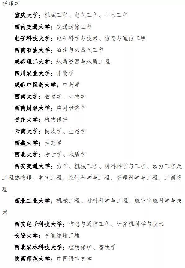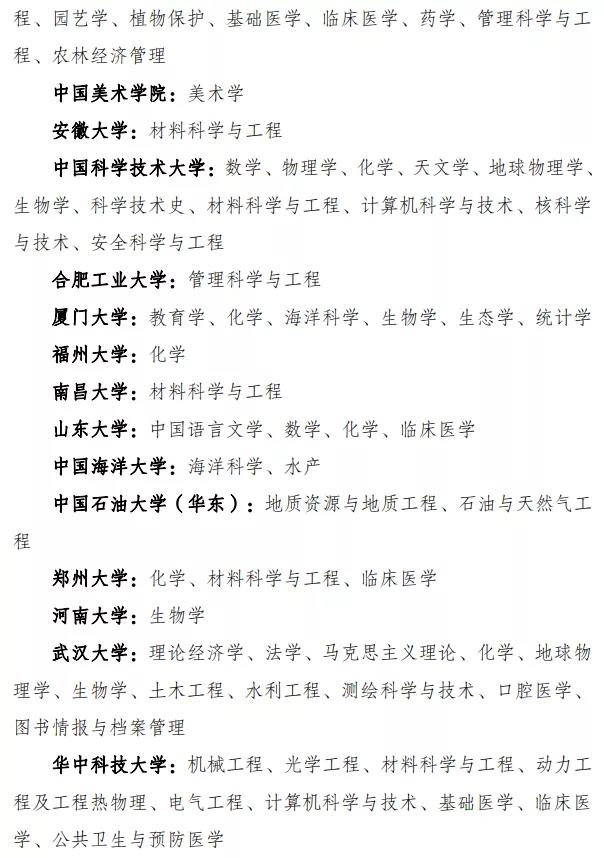 复旦大学:哲学、应用经济学、政治学、马克思主义理论、中国语言文学、外国语言文学、中国史、数学、物理学、化学、生物学、生态学、材料科学与工程、环境科学与工程、基础医学、临床医学、公共卫生与预防医学、中西医结合、药学、集成电路科学与工程