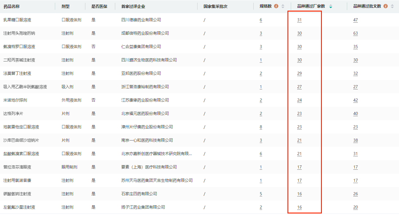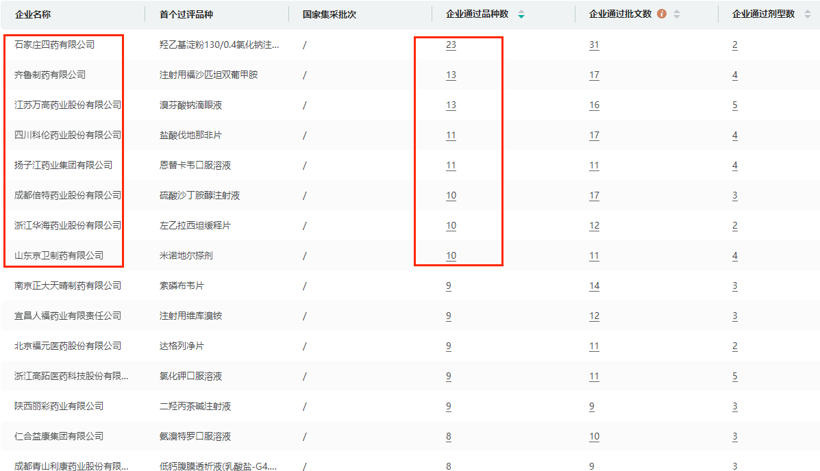 从企业情况来看,石家庄四药、齐鲁制药、江苏万高药业、科伦药业、扬子江药业、成都倍特药业、华海药业、山东京卫制药均有10个及以上的品种在列。