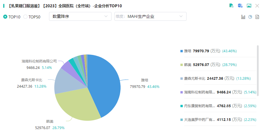 据摩熵医药数据库的销售数据显示,2023年在国内医院终端市场乳果糖口服溶液的销售额达18.40亿元,同比增长1.73%;在治疗便秘的化药产品排名中稳居首位。从TOP10企业竞争格局来看,雅培、韩美、费森尤斯卡比位居前三,分别占据43.46%、28.79%、13.28%的市场份额。