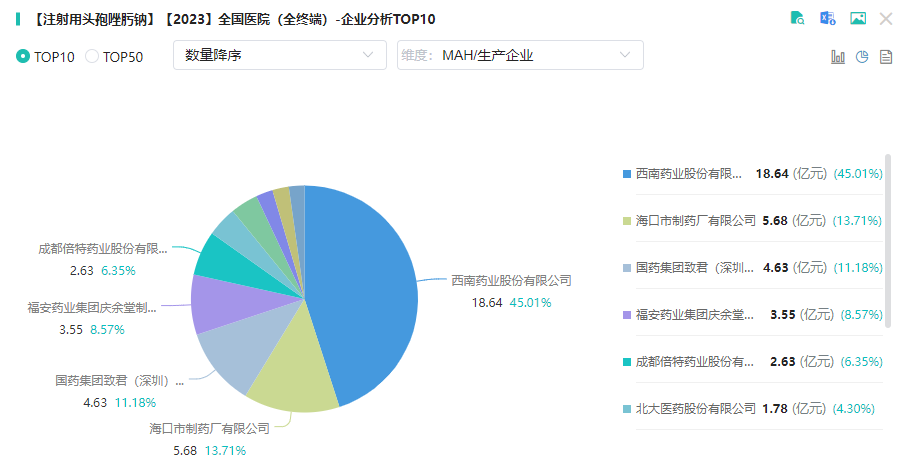 据摩熵医药销售数据显示,注射用头孢唑肟钠2023年在国内医院终端市场的销售额达到46.81亿元,同比增长1.46%。在TOP10企业竞争格局中,西南药业、海口市制药厂、国药集团致君(深圳)制药位居前三,分别占据45.01%、13.71%、11.18%的市场份额。