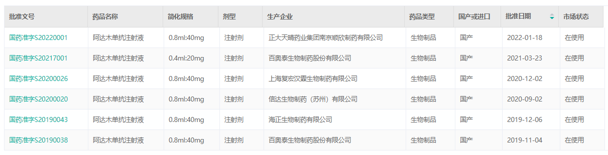 国产已获批上市的阿达木单抗
