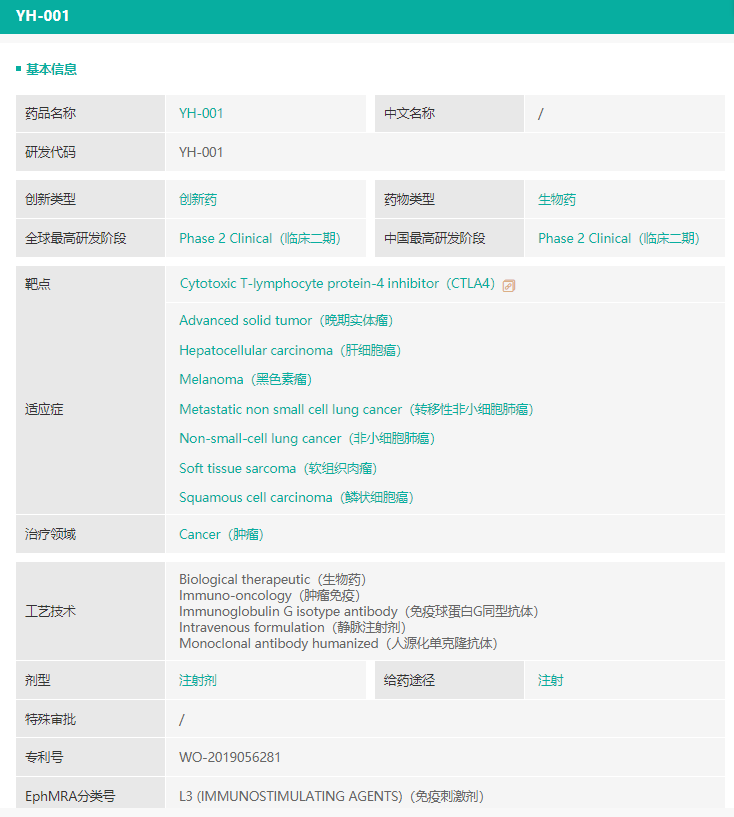 YH001是一款抗CTLA-4单克隆抗体,通过强化肿瘤微环境中调节性T细胞(Treg)的去除来提高机体自身针对肿瘤细胞的免疫反应,进而达到治疗多种肿瘤的目的。通过阻断人体抗肿瘤反应的抑制信号来增强患者对肿瘤的免疫应答,被认为是当前最有希望的肿瘤免疫疗法。CTLA-4和PD-1被认为是免疫系统的两个重要检查点(checkpoint),阻断它们可影响不同类型的T细胞从而启动抗肿瘤免疫攻击,这两个检查点也被认为是肿瘤免疫治疗的基石靶点。