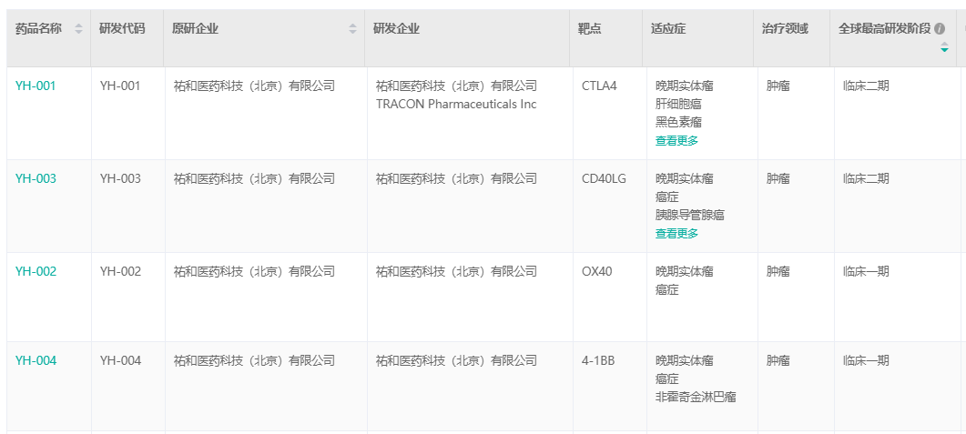 作为百奥赛图的全资子公司,祐和医药承担着为百奥赛图研发管线进行临床开发的使命,依托强大的临床开发团队和丰富的临床开发经验,为中国乃至全球患者开发满足临床需求的创新药物。祐和医药专注于开发具有自主知识产权的创新型抗体新药,研发管线主要集中在肿瘤免疫检查点(Immune Checkpoints),目前已独立开发出具有完整知识产权的、针对十多个靶点的候选抗体药。据药融云数据库显示,现阶段两个产品(YH001、YH003)已启动国际多中心(MRCT)II期临床研究;两个产品(YH002、YH004)在临床I期;另外还有5款在临床前阶段。