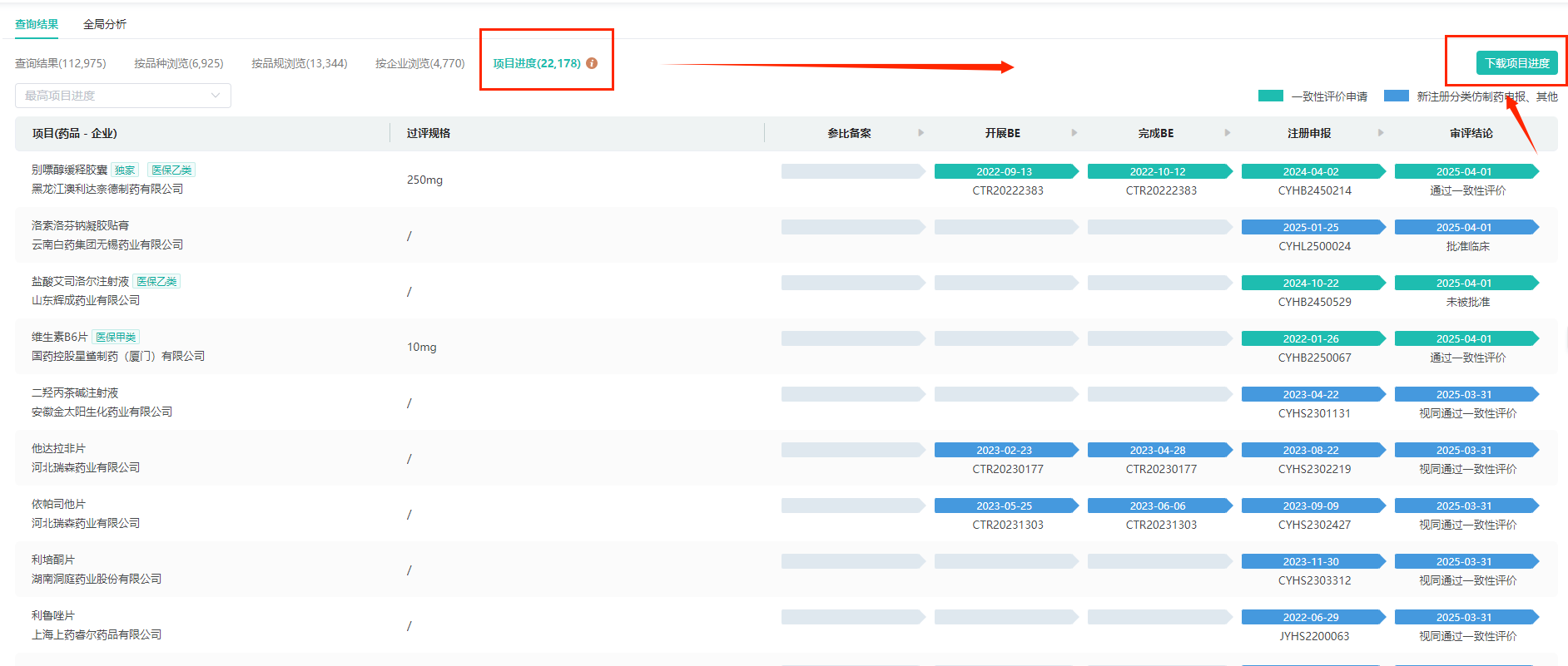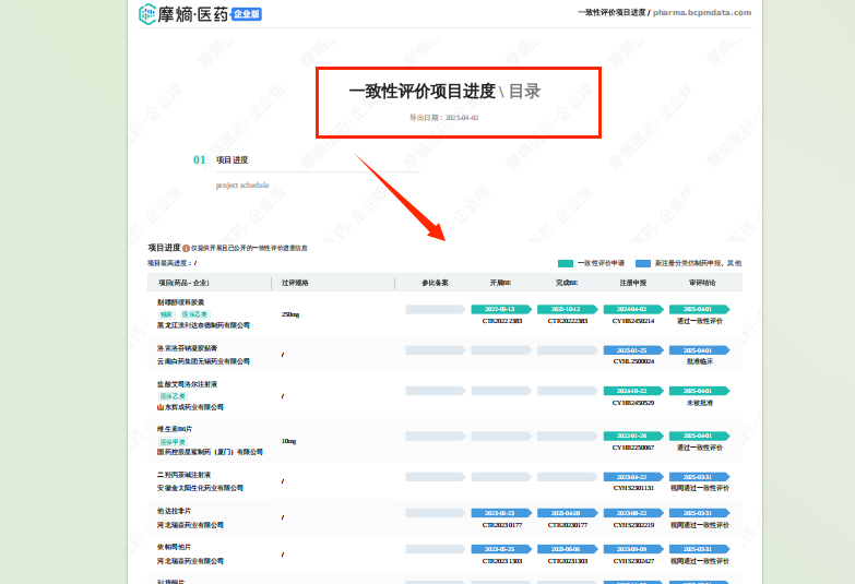 其中,一致性评价数据库查询结果列表页的项目进度维度数据,新增“下载项目进度”功能;用户可以一键将相关数据下载为PDF文件,减少用户手动整理数据的时间,保证数据的准确性,提高了工作效率。
