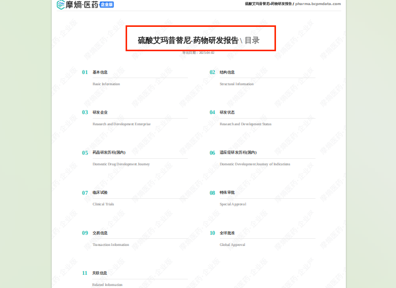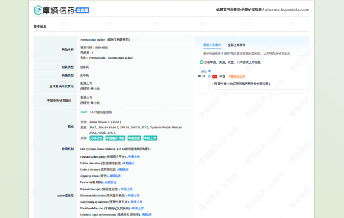 想要解锁更多药物研发信息吗?查询摩熵医药(原药融云)数据库(vip.pharnexcloud.com/?zmt-mhwz)掌握药物基本信息、市场竞争格局、销售情况与各维度分析、药企研发进展、临床试验情况、申报审批情况、各国上市情况、最新市场动态、市场规模与前景等,以及帮助企业抉择可否投入时提供数据参考!注册立享15天免费试用!