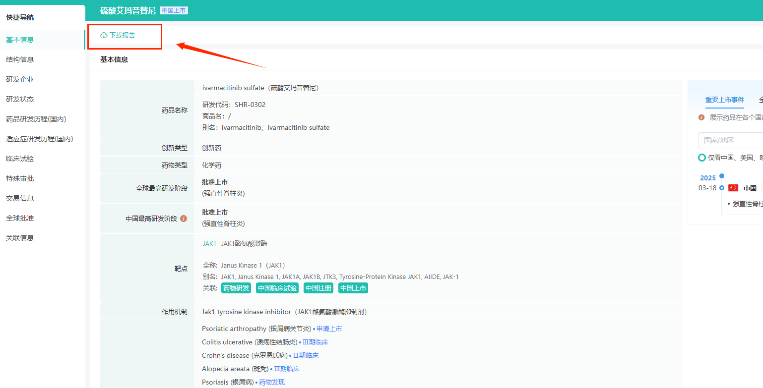 该功能不仅让用户能够轻松获取药物的基本信息、结构信息、研发状态、药品研发历程、适应症研发历程等详细信息,还能帮助用户了解药物的临床试验信息、市场信息、交易信息、专利情况等,为研发、投资、生产等决策提供有力依据。