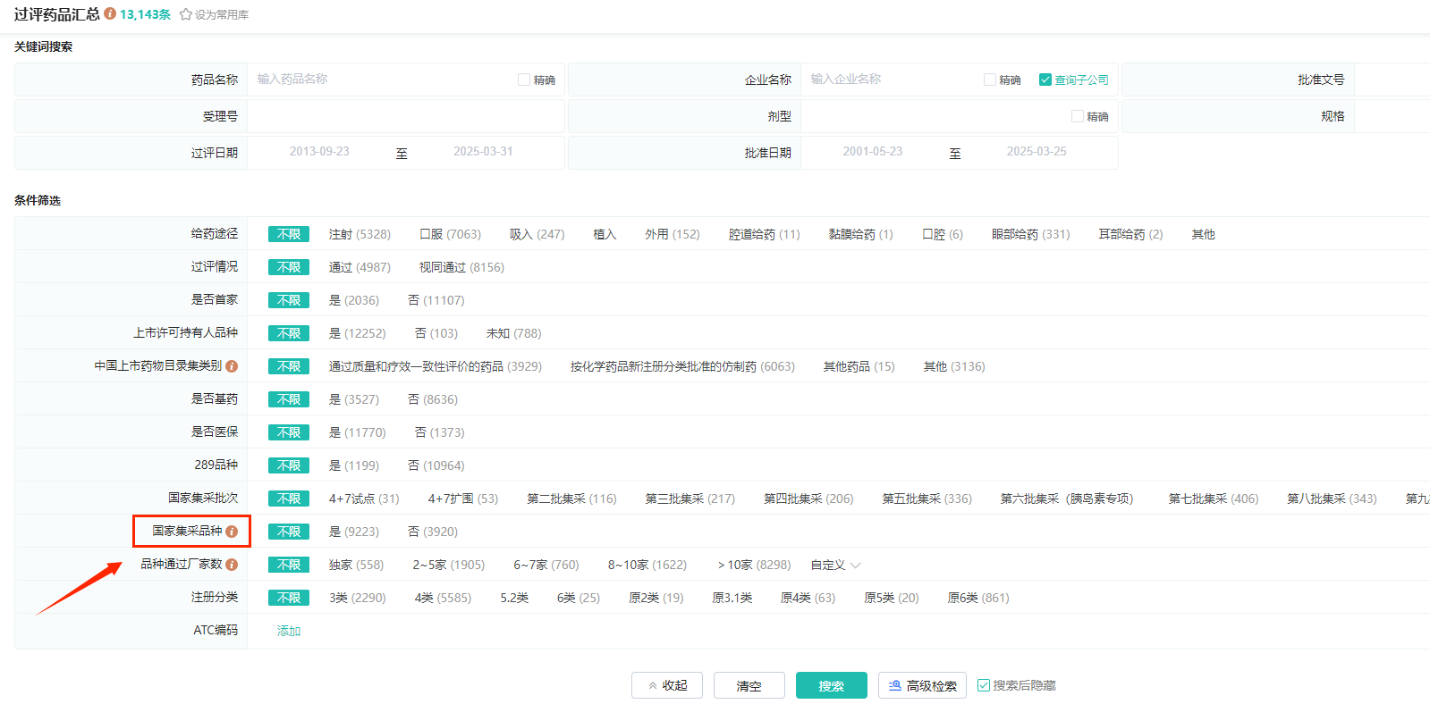 而过评药品汇总数据库,新增“国家集采品种”筛选字段,方便用户快速筛选出属于国家集中采购品种的过评药品,进行针对性的分析和研究。