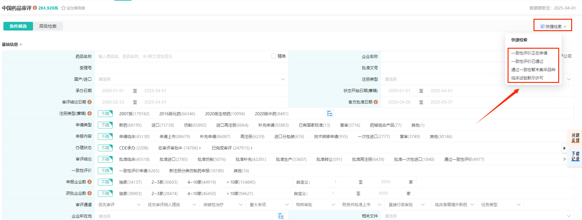 新增的快速检索功能,使用户能够迅速获取正在申请一致性评价、已通过一致性评价、通过一致性评价暂未集采品种以及已获得临床试验默示许可等的关键药品信息,节省大量数据搜集时间,显著提升检索效率。