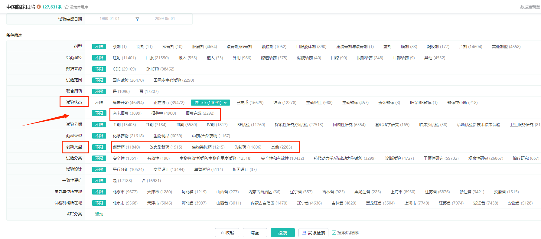 新增“招募状态”与“创新类型”两大筛选项,让用户能够快速定位到临床试验的不同状态,包括尚未开始、正在进行和已完成等,同时能迅速筛选出创新药、改良型新药、仿制药等各类药物创新类型的临床试验信息。