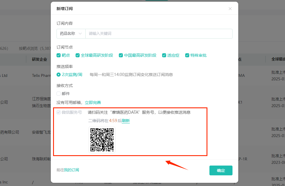 同时,我们还对摩熵医药数据库订阅功能进行了升级,新增微信服务号接收方式,让您能第一时间获取订阅的药品信息,追踪最新研发进展与市场动态,不错过任何重要资讯。