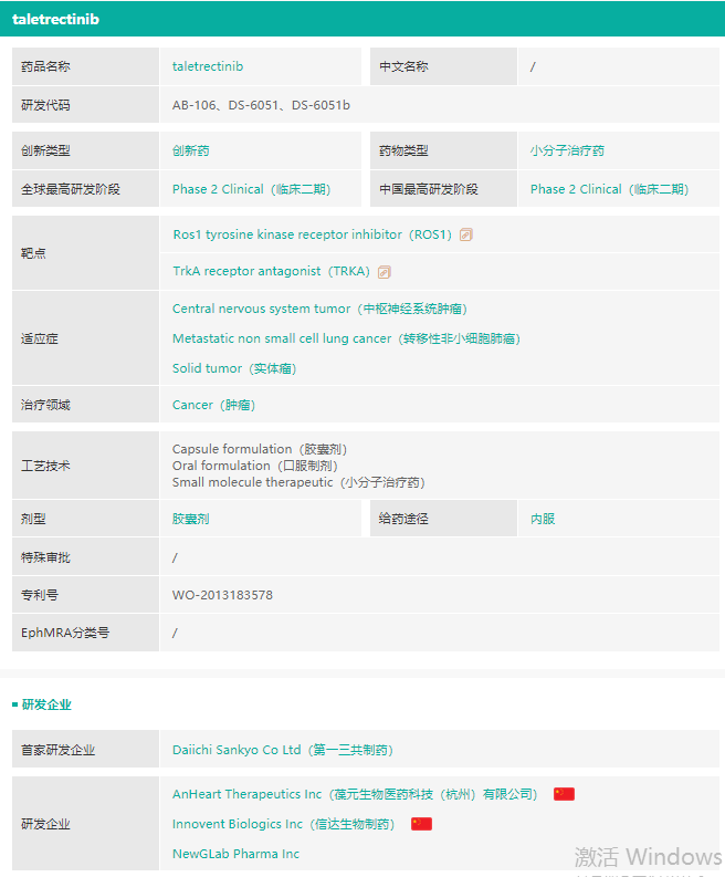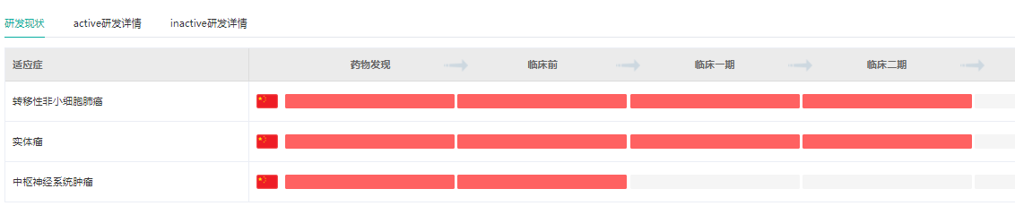 据药融云数据库显示,他雷替尼针对转移性非小细胞癌和实体瘤的适应症目前处在临床二期试验,针对中枢神经系统肿瘤的适应症还在临床前阶段。