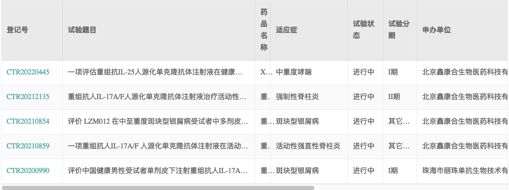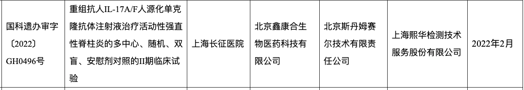 药融云数据近期显示:2022年2月,鑫康合生物发起的“重组抗人IL-17A/F人源化单克隆抗体注射液治疗活动性强直性脊柱炎的多中心、随机、双盲、安慰剂对照的II期临床试验”正在开展中。本次组长单位上海长征医院主要研究者徐沪济教授、周凌副教授。