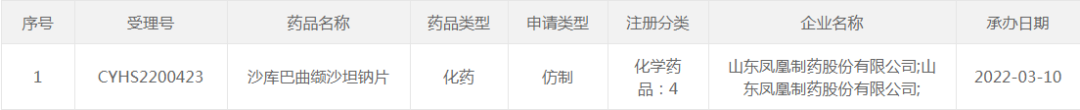 导读:3月10日,CDE承办了山东凤凰制药股份有限公司提交的关于沙库巴曲缬沙坦钠片(化学药品:4类)的上市注册申请。