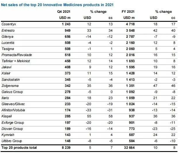 早在2017年诺华制药旗下的诺欣妥®(沙库巴曲缬沙坦钠片)就在中国获批上市,并被纳入2020年国家医保目录,且该药于2021年6月在中国率先获批用于原发性高血压治疗。根据诺华制药2021年报,诺华制药2021年净销售收入达到516.26亿美元,同比增长6%。其中Cosentyx(司库奇尤单抗)和心衰新药Entresto(沙库巴曲缬沙坦)去年合计贡献82.66亿美元,是驱动诺华制药业绩增长的最核心药物。
