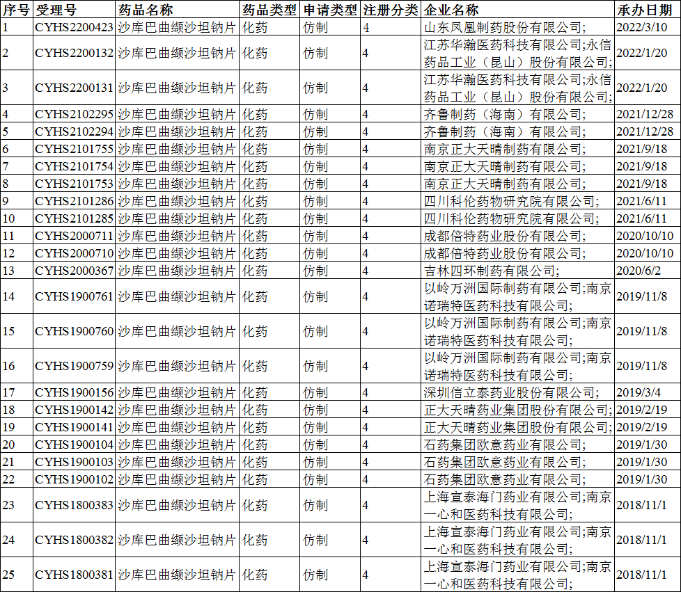 虽然没有国产沙库巴曲缬沙坦钠片产品上市,但是CDE承办的关于国产沙库巴曲缬沙坦钠片的上市注册申请并不少。根据CDE信息显示,截至2022年3月10日CDE共承办了40品规关于沙库巴曲缬沙坦钠片的上市/临床申请,其中国产药品申请上市/临床25条,覆盖了14家企业。