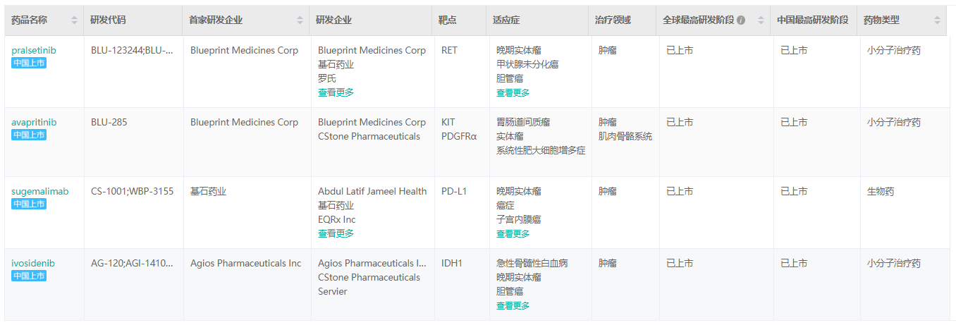 经药融云数据库查询,基石药业继普吉华®(普拉替尼胶囊、pralsetinib)之后,同类首创精准治疗药物泰吉华®(阿伐替尼片、avapritinib)、全球首个潜在同类最优PD-L1抗体药物择捷美®(舒格利单抗注射液、sugemalimab)以及国内首个IDH1抑制剂拓舒沃®(艾伏尼布片、ivosidenib)相继获批,基石药业一年之内已经在中国成功获批上市四款创新药,均在不断拓展产品适应症。
