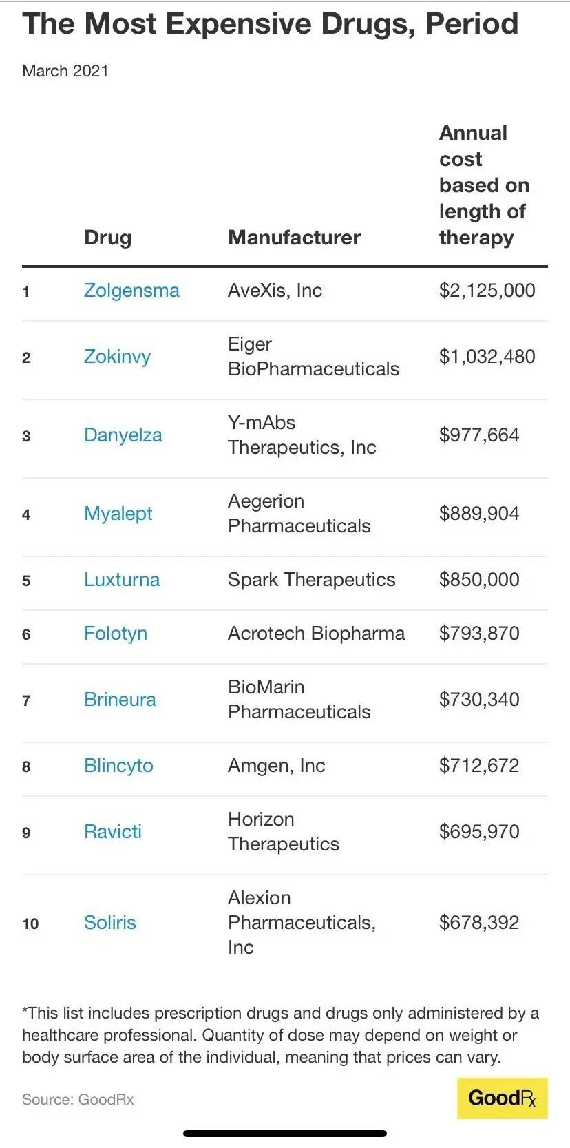 在去年2021年3月,美国上市的互联网医疗企业GoodRx公布了的10大最贵年治疗费用药物排行榜。(统计为当时美国市场治疗费用,基本也是全球最贵之20款新药)