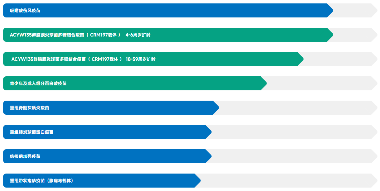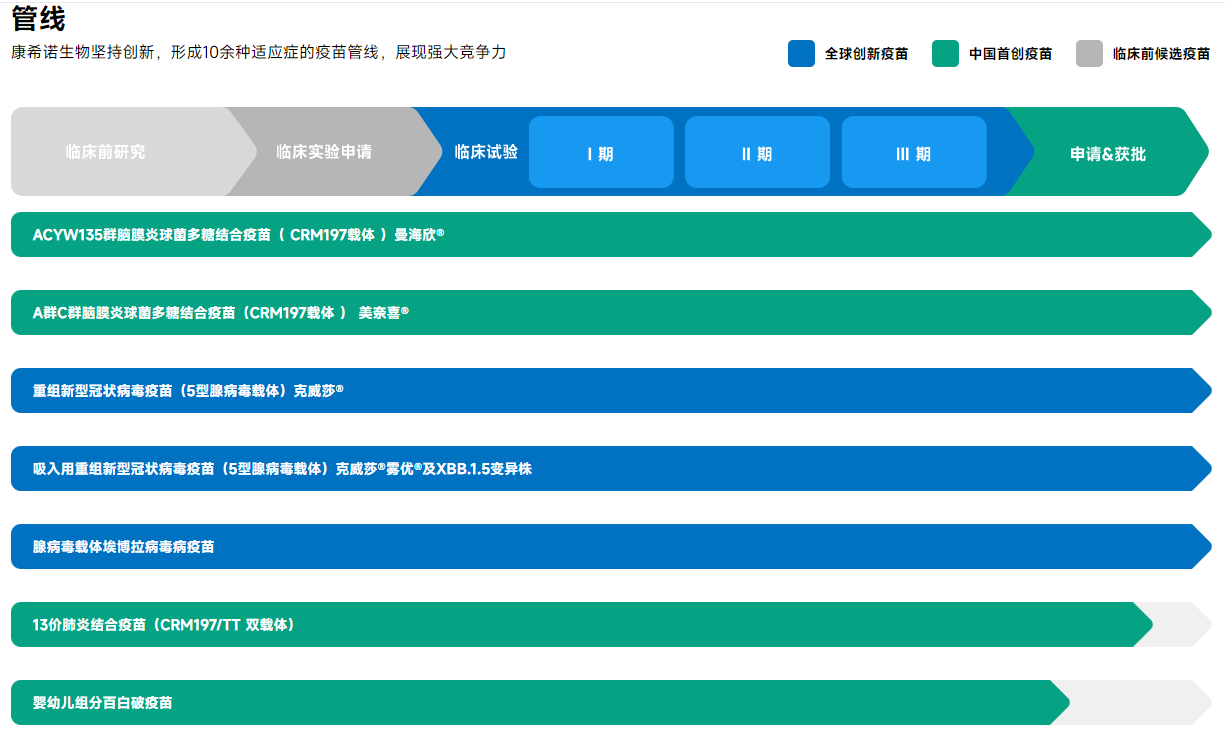 康希诺生物拥有全球创新的五大技术平台,包括病毒载体疫苗技术、合成疫苗技术、蛋白结构设计和 VLP 组装技术、mRNA 疫苗技术、制剂及给药技术,掌握多项疫苗核心知识产权及专有技术。目前已建立覆盖10余种适应症的多款创新疫苗产品,包括亚洲首款四价流脑结合疫苗曼海欣®、二价流脑结合疫苗美奈喜®、获得世卫组织认可的新冠疫苗克威莎®、全球首款吸入用新冠疫苗克威莎®雾优®以及亚洲首个重组埃博拉病毒病疫苗。