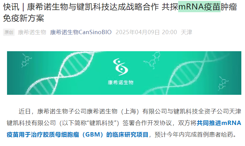 近日,康希诺生物宣布与键凯科技全资子公司天津键凯科技有限公司(以下简称“键凯科技”)签署合作开发协议,共同推进mRNA疫苗用于治疗胶质母细胞瘤(GBM)的临床研究项目,预计今年内完成首例患者给药。