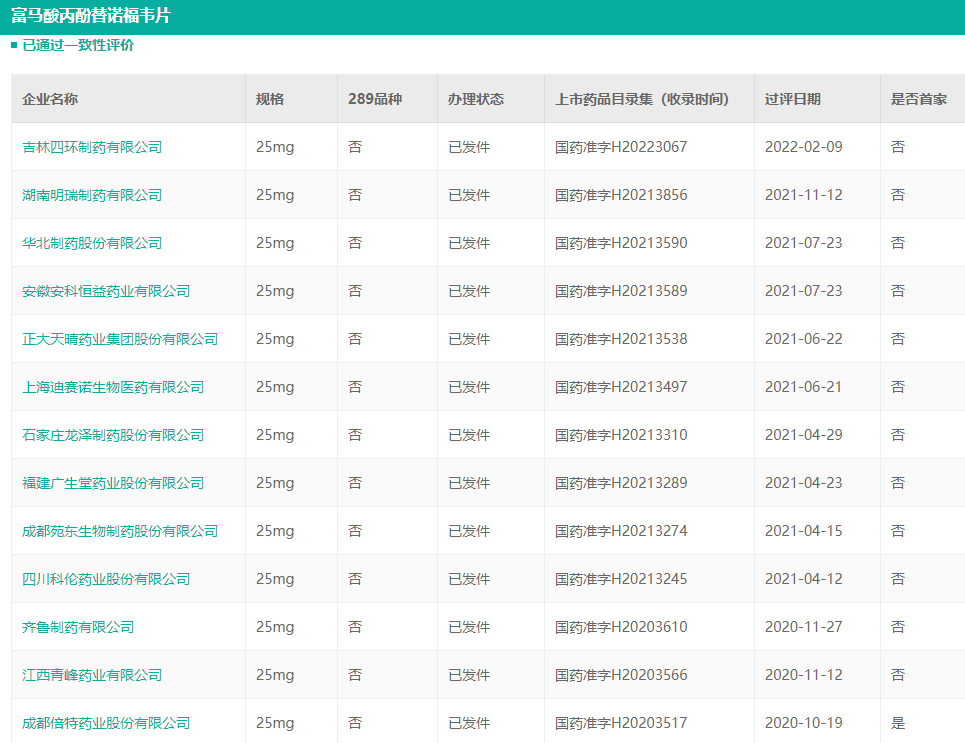 我国乙肝患者众多,肝病药物市场大,因此很多药企仿制该药物。2020年10月,NMPA签发成都倍特药业富马酸丙酚替诺福韦片批文,拿下首家过评;次月,江西青峰药业获批生产该品种,成为第2家获批的厂家;随后齐鲁制药、科伦药业、苑东生物、正大天晴等11家企业也陆续过评。