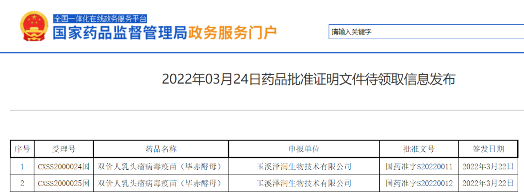 NMPA发布2022年03月24日药品批准证明文件待领取信息发布,其中玉溪泽润生物技术有限公司的双价人乳头瘤病毒疫苗(毕赤酵母)获批(玉溪泽润为沃森生物控股子公司上海泽润的全资子公司),成为第二款国产HPV疫苗,也是第二款国产双价HPV疫苗。至此,国内获批上市的HPV疫苗增至五款,格局为“2+3”——国产两款(玉溪泽润与万泰生物的双价HPV疫苗),进口三款(默沙东的四价与九价HPV疫苗,葛兰素史克的双价HPV疫苗)。