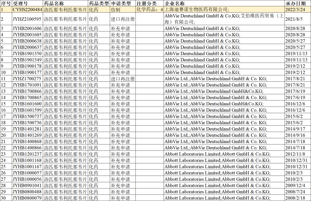 目前CDE承办的关于洛匹那韦利托那韦片的申请并不多,且除了今日上海迪赛诺生物的上市注册申请,其余均为进口再注册申请和补充申请,且均为进口产品。