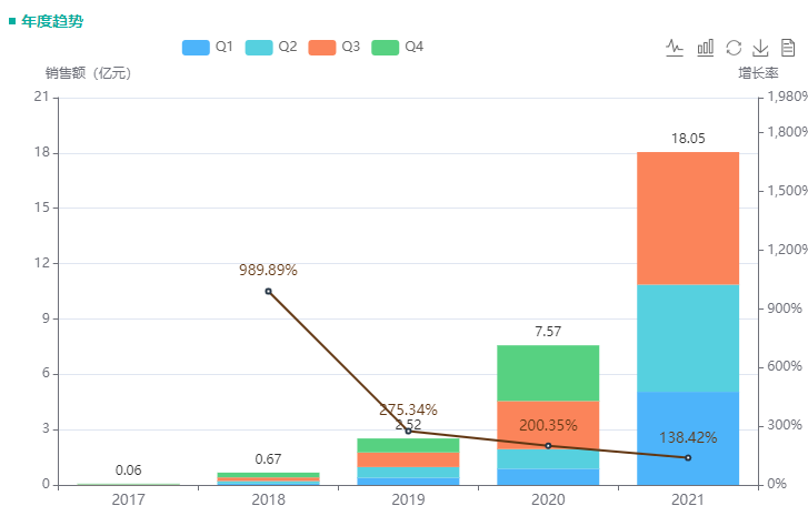 达格列净于2017年获批进入中国,作为一种单药疗法,用于2型糖尿病成人患者改善其血糖控制,为中国市场批准的首个SGLT2抑制剂。后被纳入医保(乙类),其销售额也一路猛增:2021年前三季度院内销售额达18亿,同比增长了近300%。