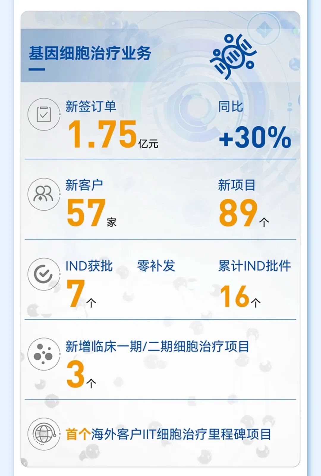 - 基因细胞治疗业务:实现收入0.64亿元,占总营收的2%,同比增长23%;