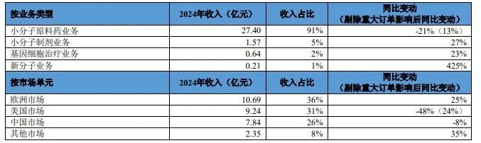 - 小分子原料药业务:实现收入27.4亿元,占总营收的91%,同比下降21%,剔除重大订单影响后同比增长13%;