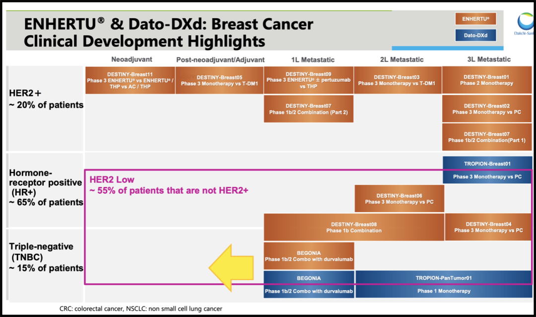 第一三共制药通过DS-8201与DS-1062的临床开发试图将乳腺癌治疗分类改写为HER2阳性乳腺癌与HER2低表达乳腺癌。
