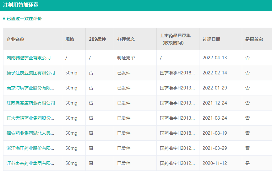注射用胸腺法新生产企业众多,其院内市场主要由原研美国赛生药业、成都地奥九泓制药厂和海南中和药业等占领。目前已有海南双成药业(仿制药首家)、江苏诺泰澳赛诺、扬子江药业、瑞阳制药、深圳翰宇药业、苏州天马医药和此次的湖南赛隆药业通过仿制药一致性过评,另有海南中和药业、上海上药、成都圣诺和朗天药业递交了仿制药一致性评价补充申请。