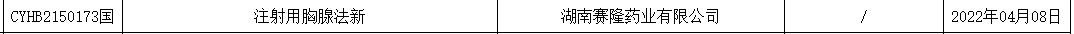 4月13日,NMPA发布最新一批药品批准证明文件待领取信息,其中,湖南赛隆药业2款药品通过仿制药一致性评价,分别为注射用胸腺法新和注射用替加环素。同日拿下10亿+免疫调节剂、抗菌药物仿制药过评。