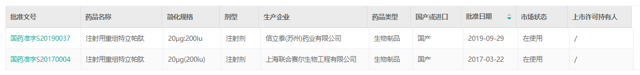 另外,据查询,此次为信立泰已过评的第二款特立帕肽产品,此前在2019年9月,信立泰递交的注射用重组特立帕肽也获批上市。该品种目前国内仅有两家企业过评,另一家是上海联合赛尔生物。