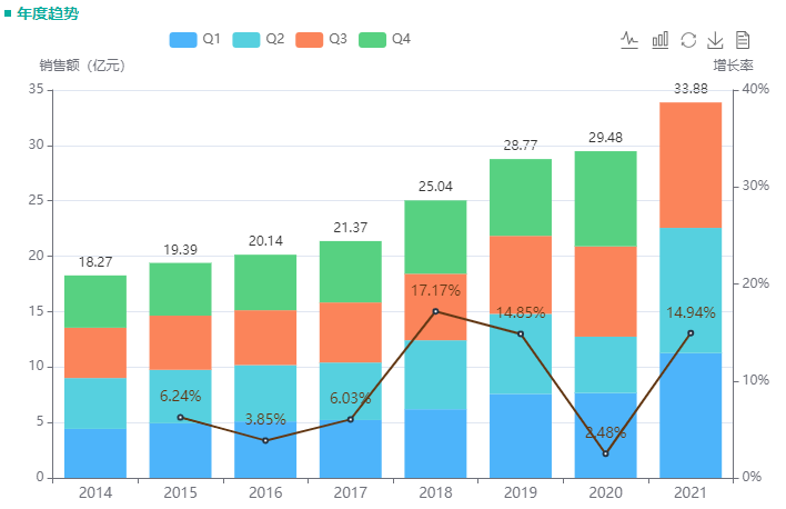 艾司奥美拉唑钠为新一代质子泵抑制剂,是目前消化性溃疡的一线治疗药物,主要用于治疗消化性溃疡、胃食管反流性疾病、糜烂性反流性食管炎等,具有疗程短、疗效稳定、起效快速持久等优势。据药融云统计,艾司奥美拉唑钠近年院内销售额均在33亿左右,2021年前三季度已完成“KPI”,年总销售额将破新高。