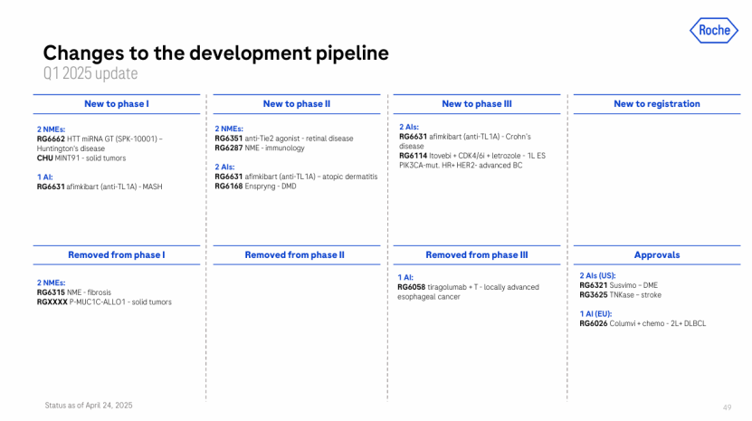 业绩增长主要得益于五大产品——Phesgo(5.93亿瑞士法郎,+52%)、Vabysmo(10.18亿瑞士法郎,18%)、Xolair(6.45亿瑞士法郎,+26%)、Hemlibra 和 Xofluza,总销售额达 36 亿瑞士法郎,按固定汇率计算,比2024 年Q1增长了 7 亿瑞士法郎。