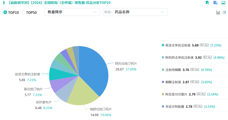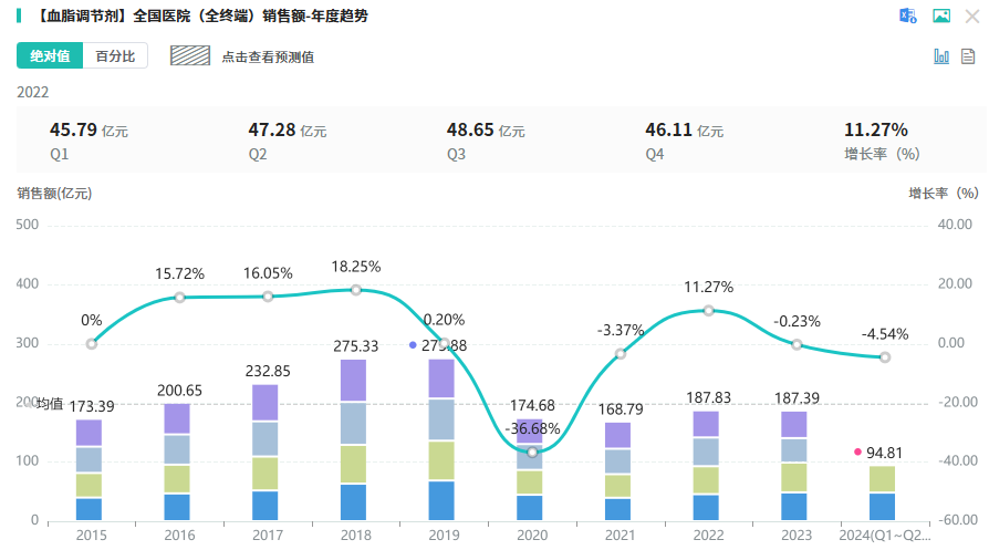 据摩熵医药数据库-销售数据库显示,2023年降脂药全国医院端销售额为187.39亿元,2024上半年为94.81亿元。