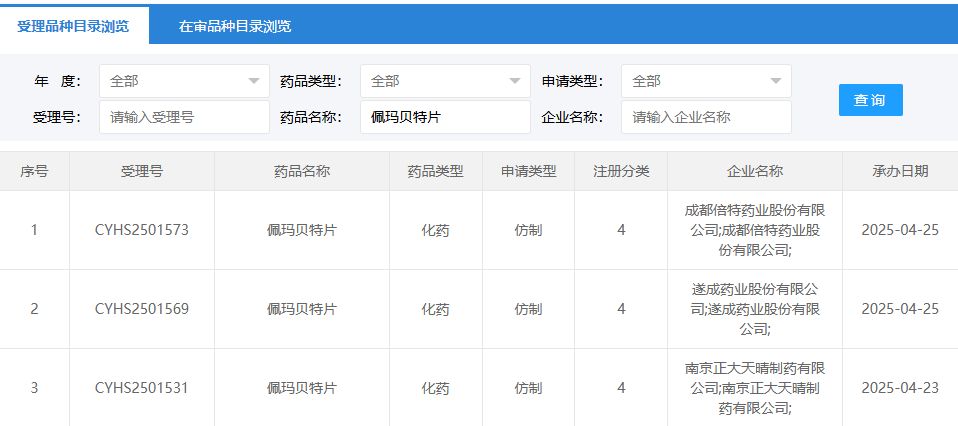 近日,正大天晴制药、倍特药业、遂成药业递交的佩玛贝特片的4类仿制药上市申请先后获得CDE受理,其中正大天晴于4月23日率先抢得首仿报产。