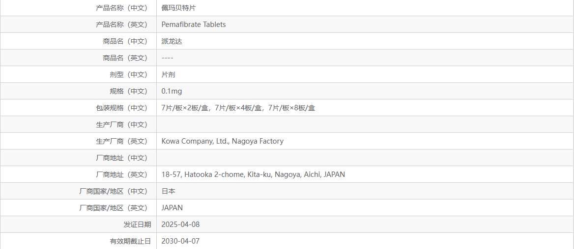 佩玛贝特片是日本兴和株式会社(Kowa Company)开发的一种新型、高选择性的过氧化物酶体增殖物激活受体α(PPARα)调节剂,它通过与PPARα结合并调节参与脂质代谢的基因的表达,从而降低血浆甘油三酯(TG)水平和提升高密度脂蛋白胆固醇(HDL-C)水平,以达到降脂的目的。该药还在非酒精性脂肪肝、高胆固醇血症和原发性胆汁性胆管炎等适应症方面展现潜力。2017年在日本获批上市。