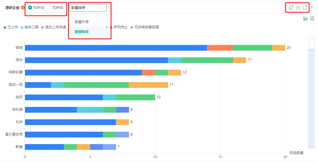 在各数据库的全局分析中,不同维度的柱状图数据展现,增加了【升序/降序】【放大/缩小】及表【导出】功能;不同维度统计数据可选择Top10或者TOP50,也支持导出全部数据,自动生成统计图;同时,也可根据个人需要,选择重点关注的维度进行展示,其他维度可隐藏。