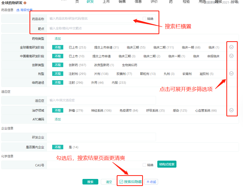 全球上市药品筛选系数据库增加了更多的条件筛选项,便于用户更加精准高效地筛选数据信息。新增的筛选项包括剂型、给药途径、市场状态、处方类型、药物标签、评审文件、说明书、辅料信息等等。