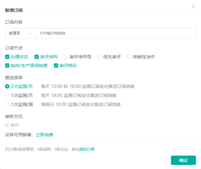 我们增加了订阅功能,可定期监测您所订阅的受理号办理状态,当办理状态/审评序列/审评结论等节点出现变化时,会自动将更新信息点对点推送至您的邮箱。不必反复查询,也能随时关注。