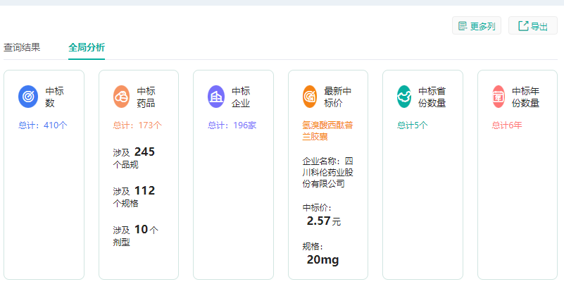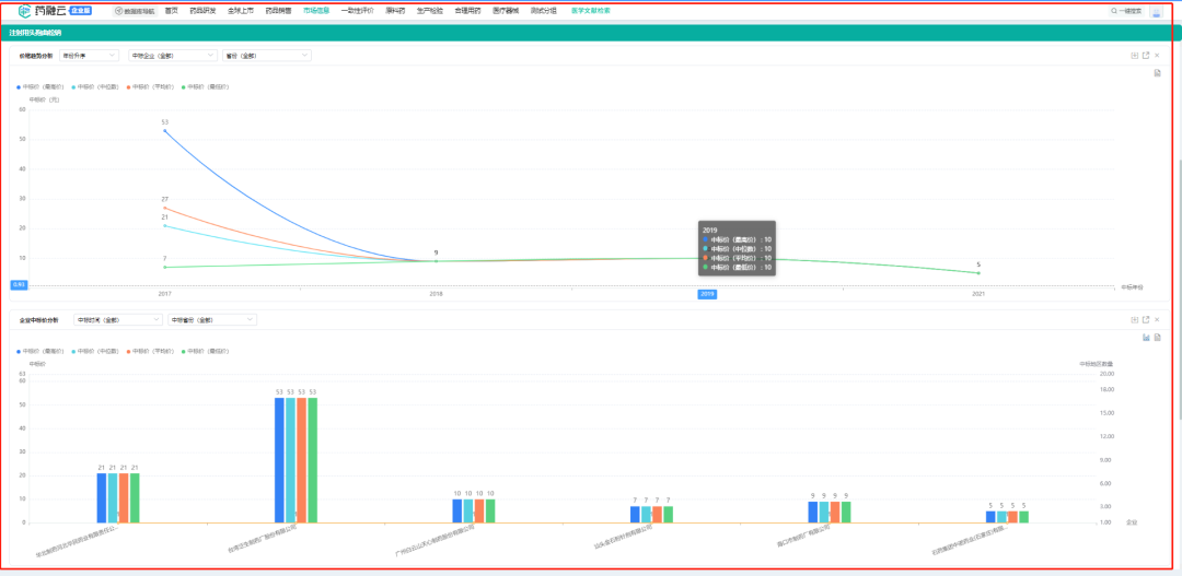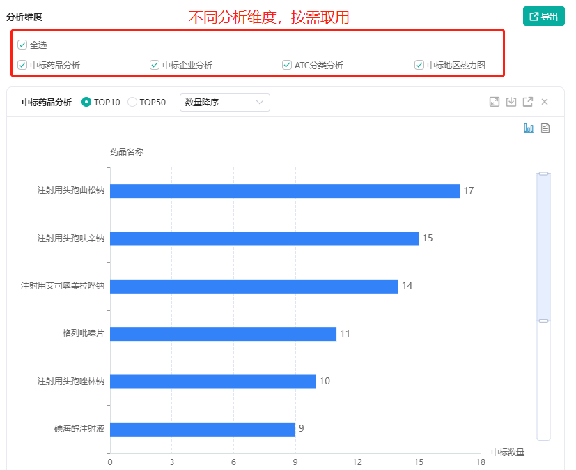 为药品招投标数据增加可视化分析模块,除整体数据统计外,还可查看中标药品、中标企业、ATC分类和中标地区热力图等不同维度的数据统计图。