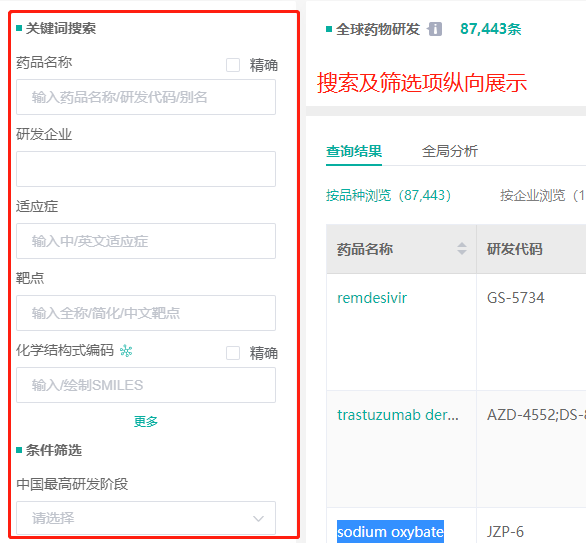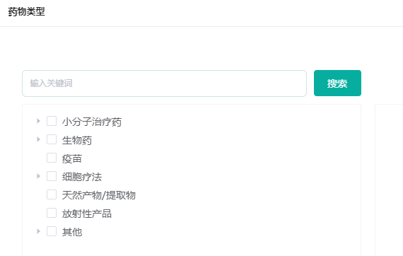 以全球药物研发数据库为例,筛选标签中细化了【药物类型】,同时支持关键词搜索。