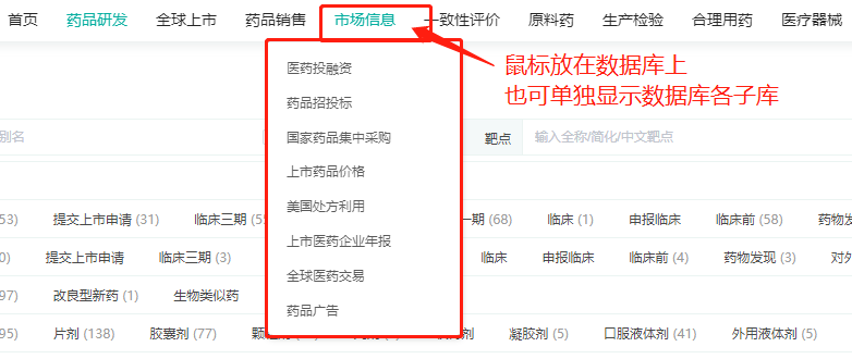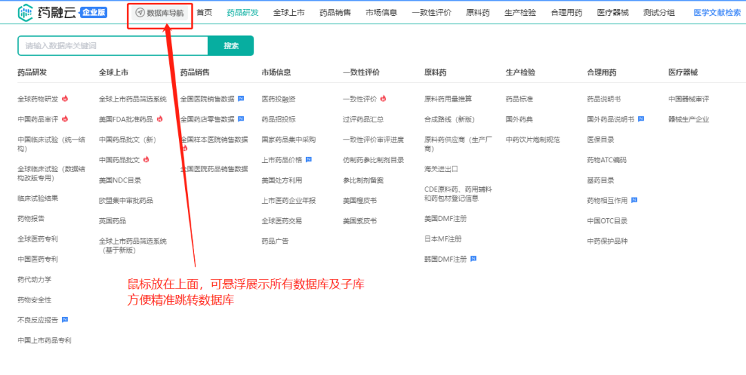 想去其他库,不知道具体位置?“摸石头”式找数据?在在药融云企业版4.0中,鼠标直接放置在顶部「数据库导航」或单独的数据库名称上,不用点击,可以自动悬浮展示所有的数据库及子库,再点击想要搜索的子数据库,转移“阵地”不再盲目!