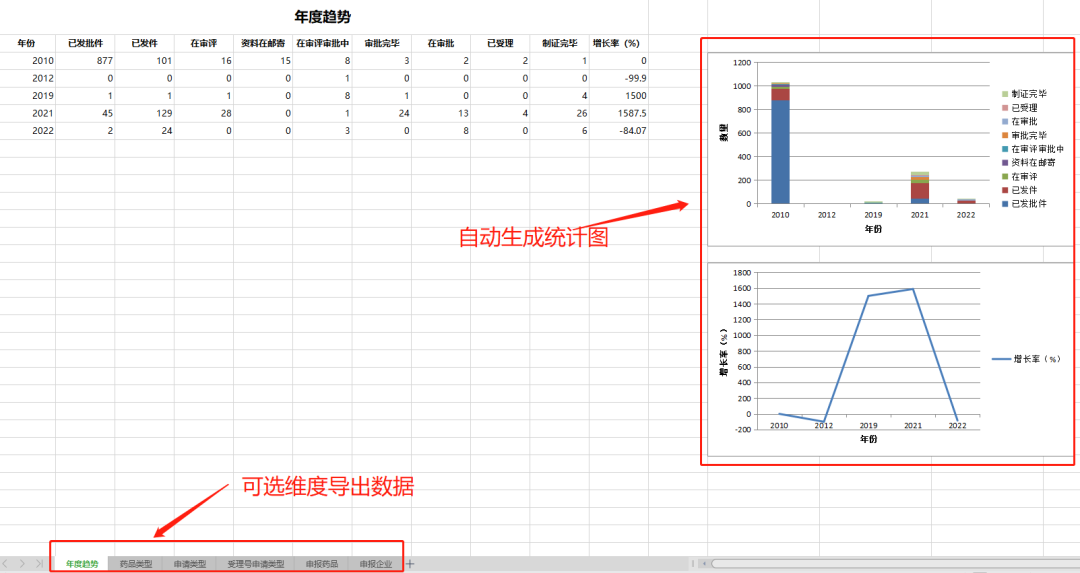 以中国药品审评数据库为例,可选择年度趋势、药品类型、申请类型、受理号申请类型、申报药品和申报企业等不同维度进行数据导出,导出结果中也将分维度展示数据,并自动生成统计图,方便有统计需要的用户初步了解数据情况。